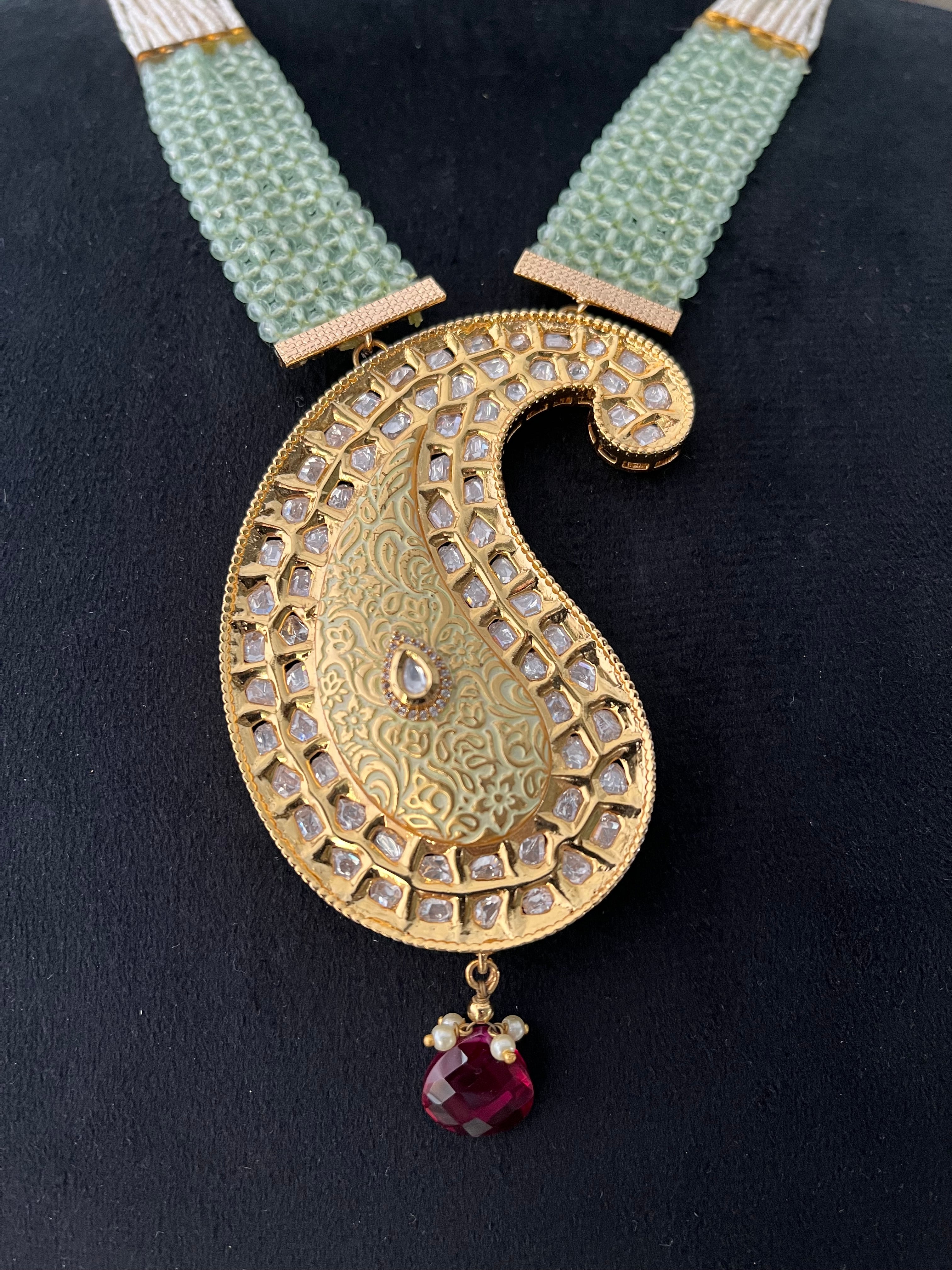 Brass based long polki Necklace set with mint and white colour designer mala