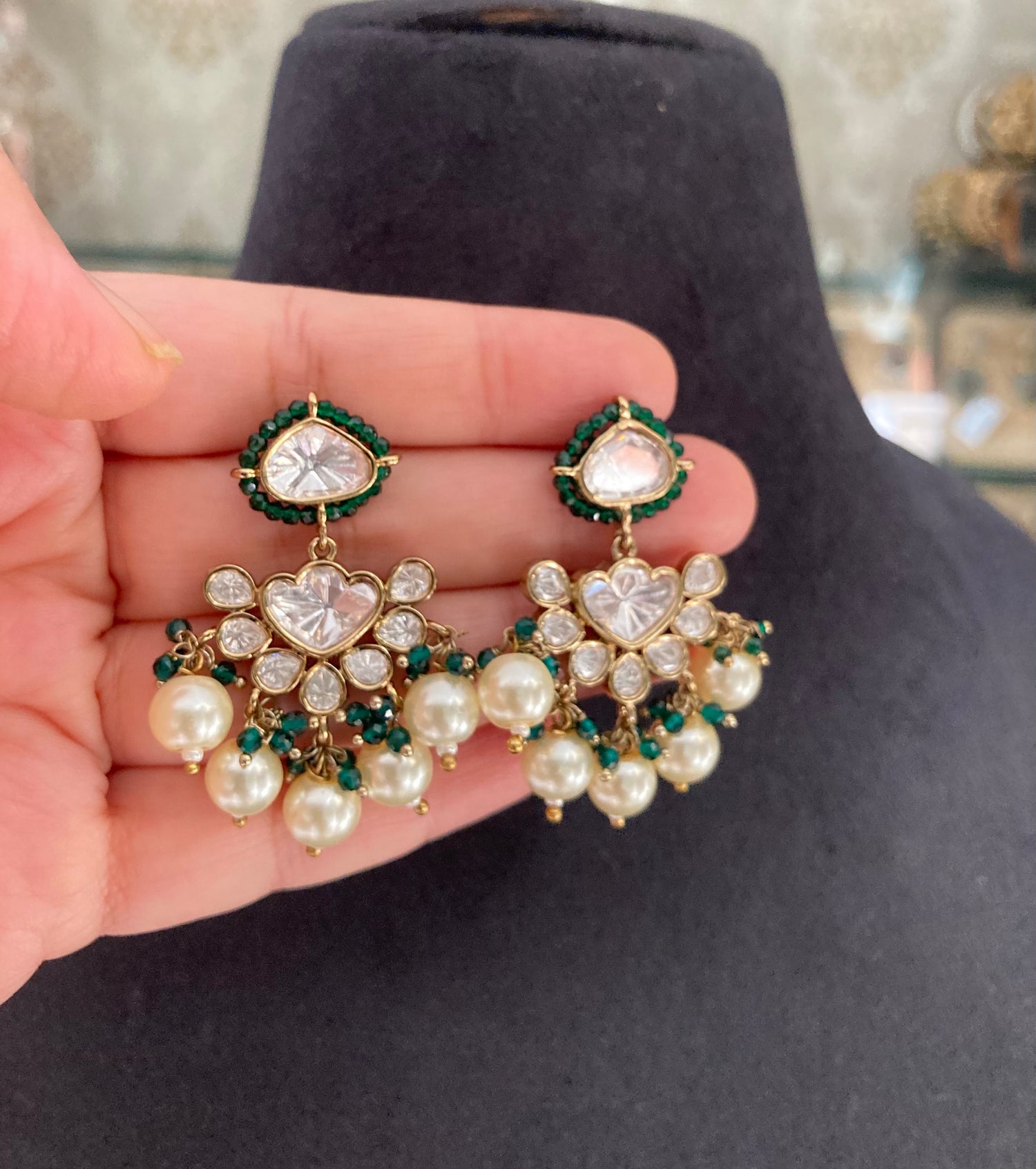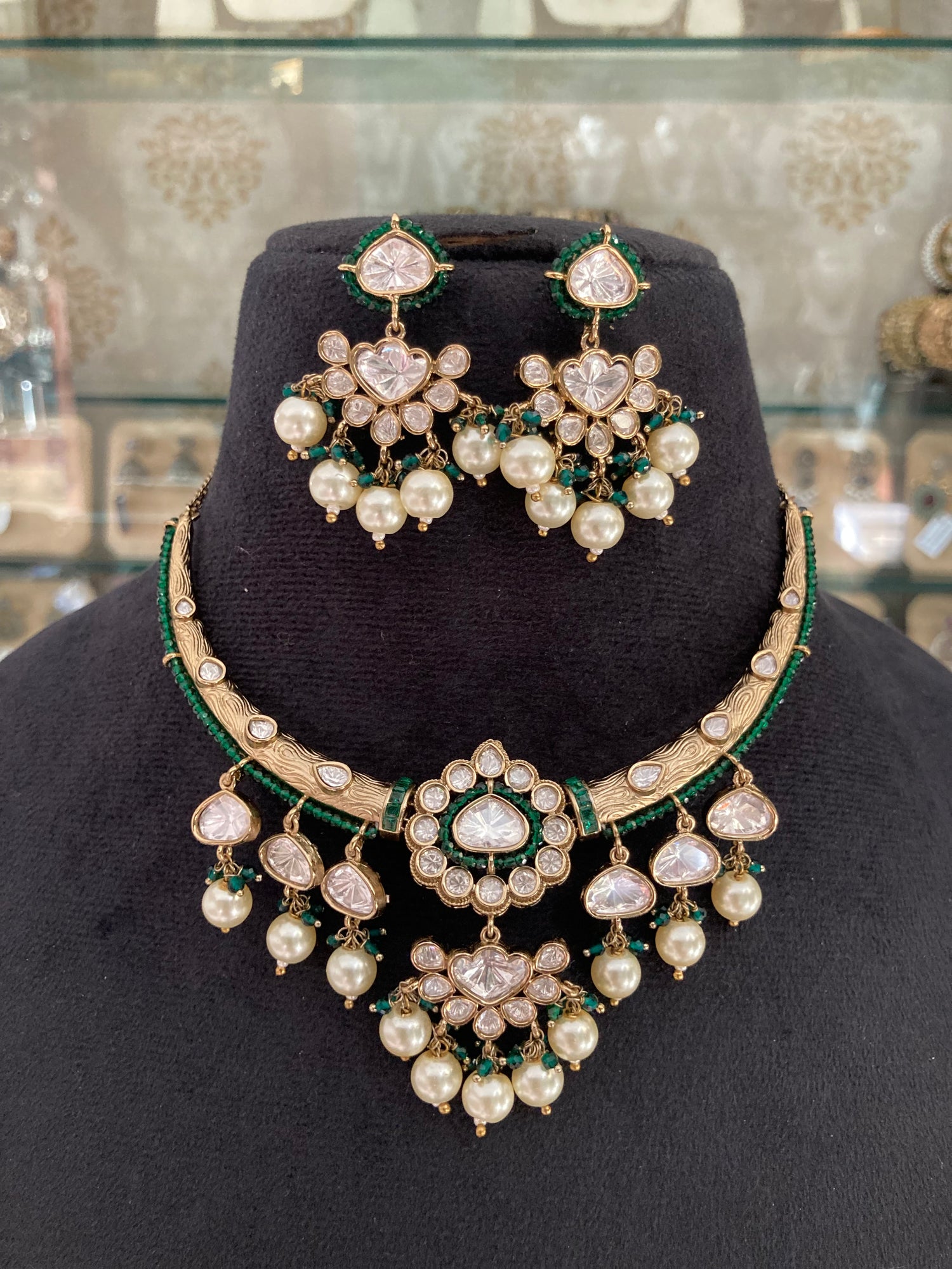 Brass based premium quality antique, finish with With green and Pearl beads Necklace with earrings